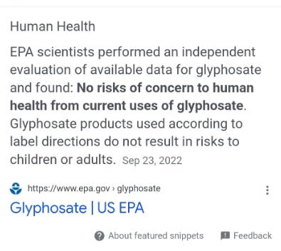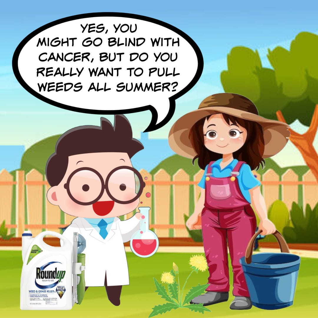In fact, the Environmental Protection Agency (EPA) doubled down and continues to maintain that there is absolutely no risk to human health and no evidence glyphosate causes cancer. And like my mom says, “the FDA wouldn’t approve it if it was bad!”. So ignore those pesky conspiracy theories being pushed by the annoying conspiracy theorists because they want your yard full of weeds!