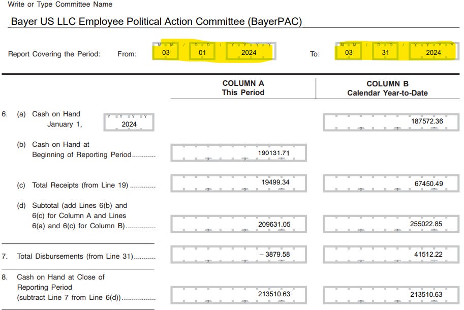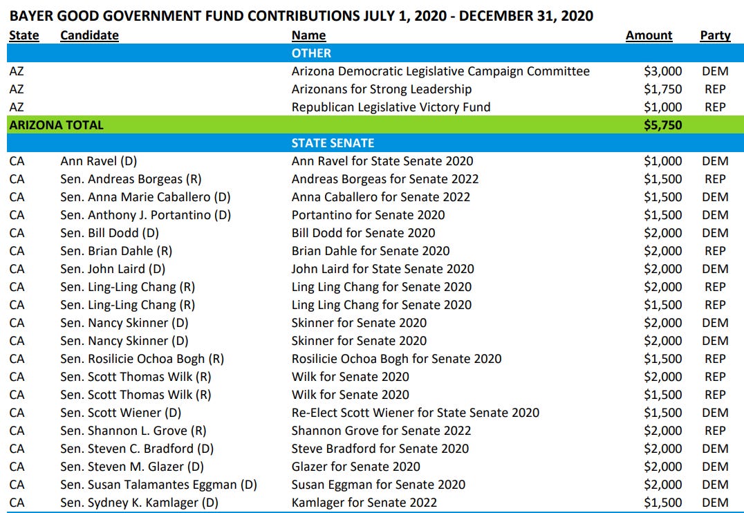 Bayer also makes contributions outside of BAYERPAC. You can view some of their 2020 contributions here, there are a lot of them. They donate to both parties.