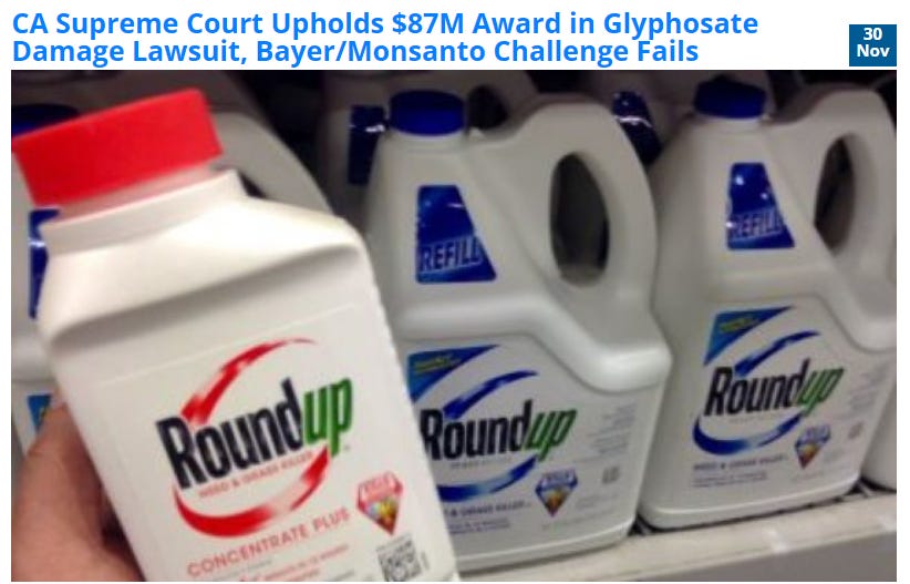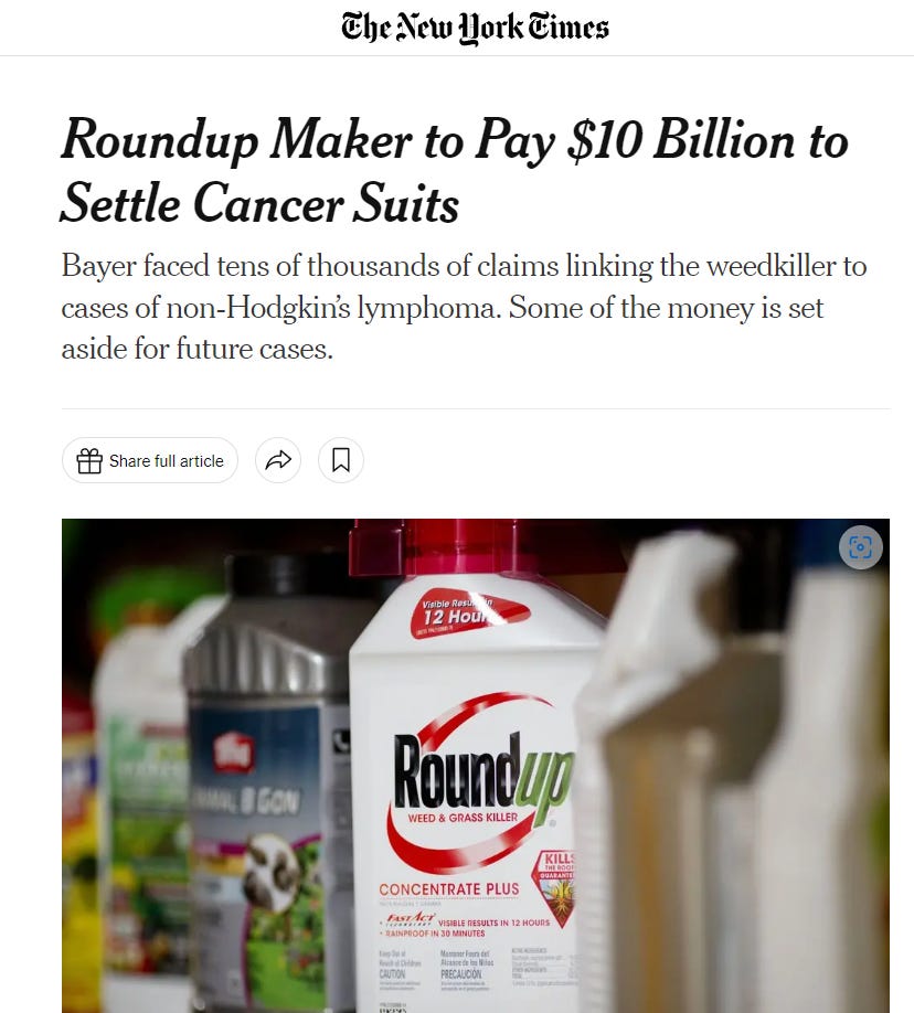 Permanent health damage and death has resulted in ongoing lawsuits and settlements yet the chemical keeps selling, crops keep getting sprayed and people keep getting sick. Reality is, none of this matters because, just like with pharmaceuticals, the profit continues to outweigh the loss. Let’s look at a couple of the lawsuits: