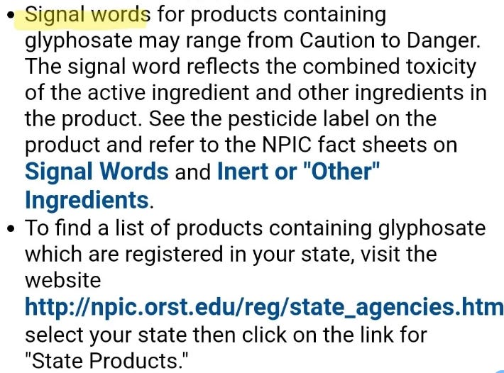 Due to these highly scientific trials, the FDA and EPA gave RoundUp, Scotty and the totally harmless Trade Secret blend the green light. BUT, they wanted to do their jobs to the fullest by making sure the good, hardworking people and all the illegal immigrants of the United States were kept safe, so they said RoundUp would need a disclaimer added to the product labeling. They requested that the label displays a "signal word”, that can “range from Caution to Danger”: