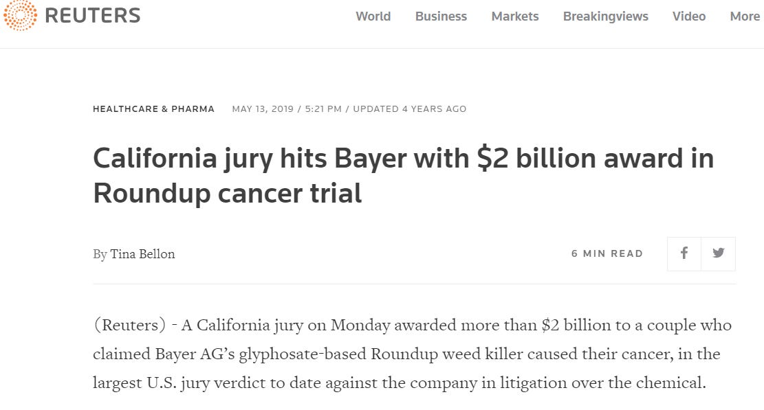 On May 13, 2019, a jury in California ordered Bayer to pay a couple $2 billion in damages