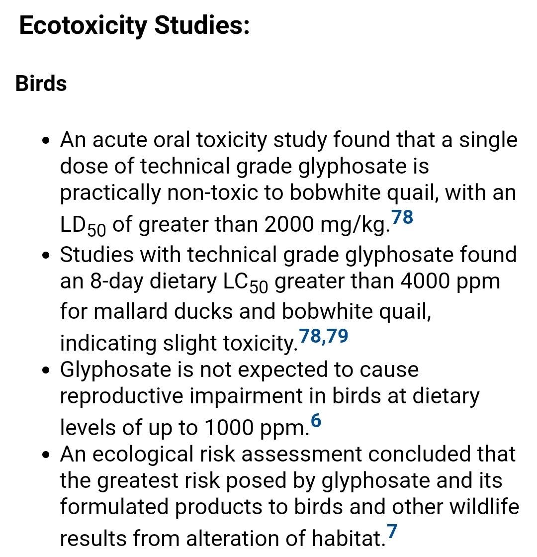 In a second study, birds were fed glyphosate for 8 days. This study conclusively proved that glyphosate is only “slightly toxic”, so that’s great!