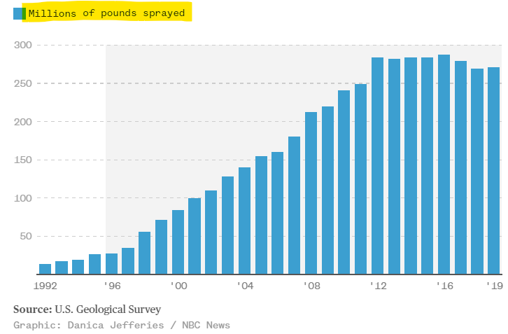 Here’s a chart showing the MILLIONS of pounds sprayed, by year, 1992 - 2019: (1 million pounds = 453,592kg)