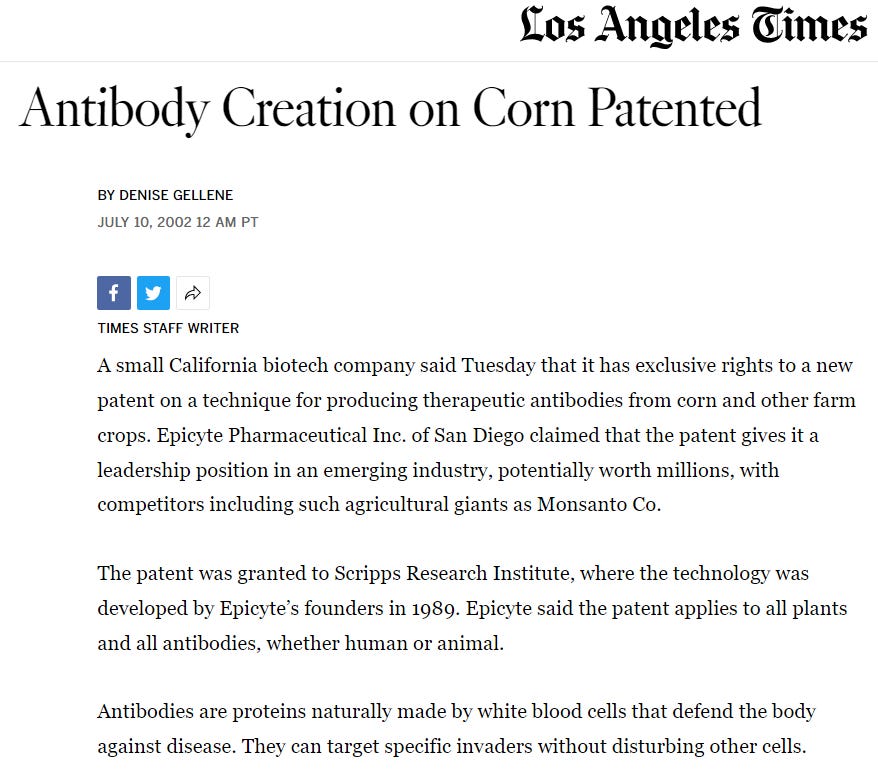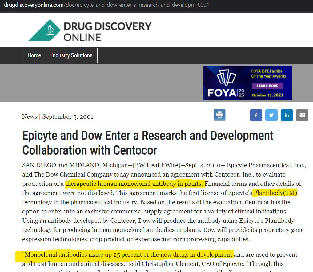 September 5th, 2001: Epicyte (Actually MS/DP) joined forces again with Dow Chemical (MS/DP/DOW), and together they threesome-ed Monoclonal Antibodies in plants: