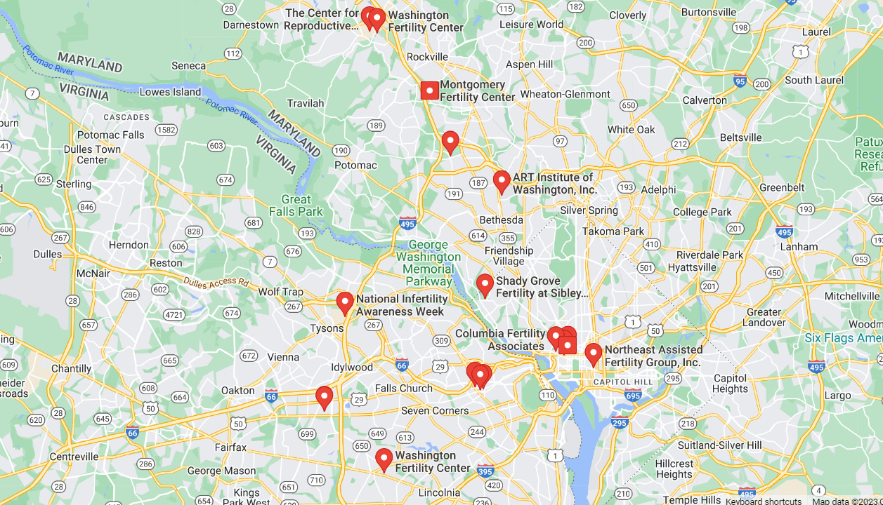 Check this out, here’s September 2023 Fertility Clinic locations just in this specific area in Washington DC / Virginia. I didn’t select this area for any specific reason. I guess my VPN was set to VA so when I Google searched “Fertility Clinics Near Me” this craziness is what came up. I assume every state is like this:
