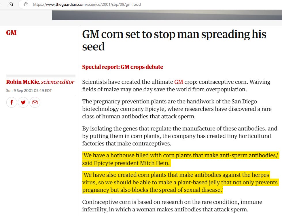 2001: On September 9th of 2001, less than 48 hours before the 9/11 Twin TowerTerrorist Attacks occurred, The Guardian broke a story about a new type of corn that intentionally acts as a spermicide. In the article they stated that it had just been developed and was about to be released by Epicyte (MS/DP/DOW). The article says: