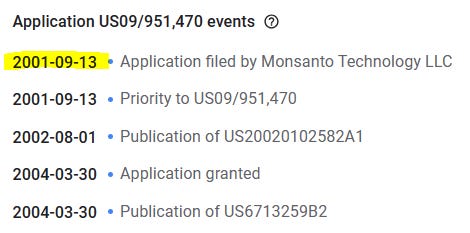 2001: September 13th, only 4 days after The Guardian story broke, while all of the media was focused on 9/11, Monsanto filed a patent for a NEW TYPE of genetically modified corn, referred to as “MON810”: