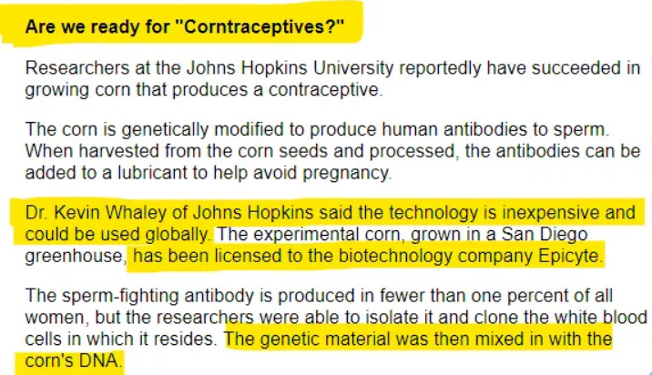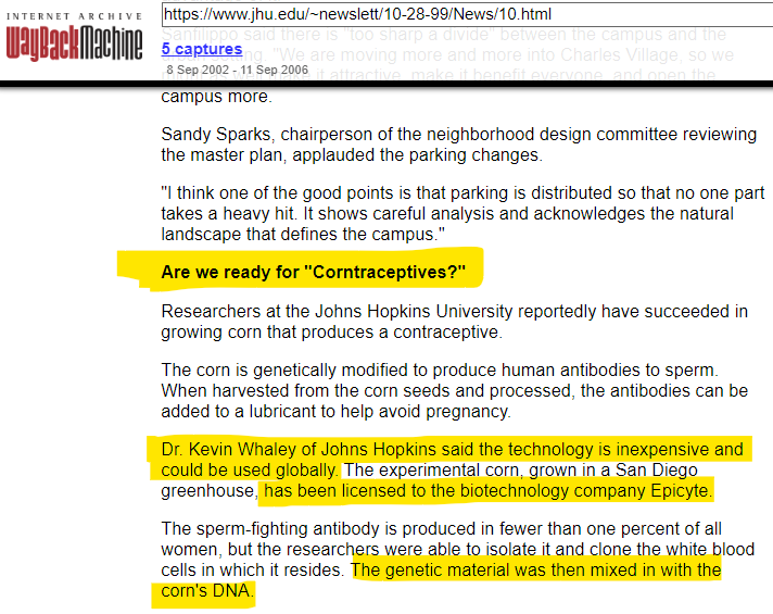 2006: Remember the John-Wick-Movie-Suspense I mentioned? Johns Hopkins University scrubs that press release from 1999 about their incredible invention, you know, that GMO Corn that they called “an inexpensive contraceptive” that “can be used globally”:
