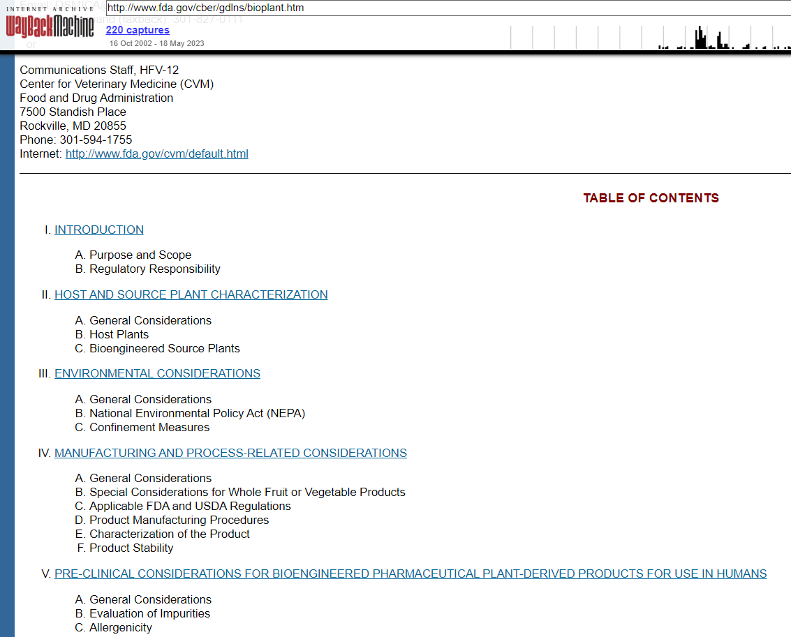 2009: Back in September, 2002, the FDA and USDA released a document titled “Guidance for Industry: Drugs, Biologics, and Medical Devices Derived from Bioengineered Plants for Use in Humans and Animals”, which seems like some useful info, eh?