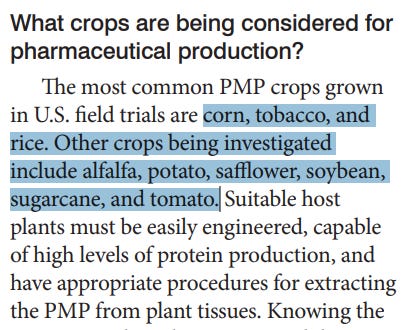 2008: Colorado State University published a very disturbing Biopharming FAQ sheet. This document outlines that drugged plants now have an official name, “Plant-Made Pharmaceuticals”, PMPs, for short, because everything has to have a stupid 3-letter name. Their document goes on to say which plants are currently being Pharmed, which, back in ‘08, was corn, tobacco and rice, however, crops that were being considered included alfalfa, potato, soybean, sugarcane, tomato and safflower: