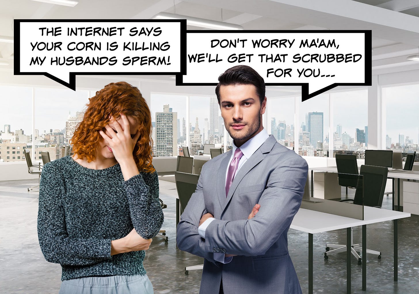 Trickery, right before your eyes: The new press release was super-duper clever; instead of talking about the sperm-killing-corn, they sneakily gave the definition of Antibodies. They said “Antibodies are proteins that defend the body against disease”, meanwhile, the word “sperm” appears exactly 0 times in this new press release. And did you catch that? They indirectly refer to sperm as a DISEASE. Not their sperm, of course. Just your sperm. Or your husbands sperm. Or whatever sperm is in your household. Yes, that includes your gerbil. There’s enough anti-sperm antibodies to go around. Sit down Oprah.