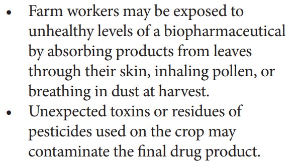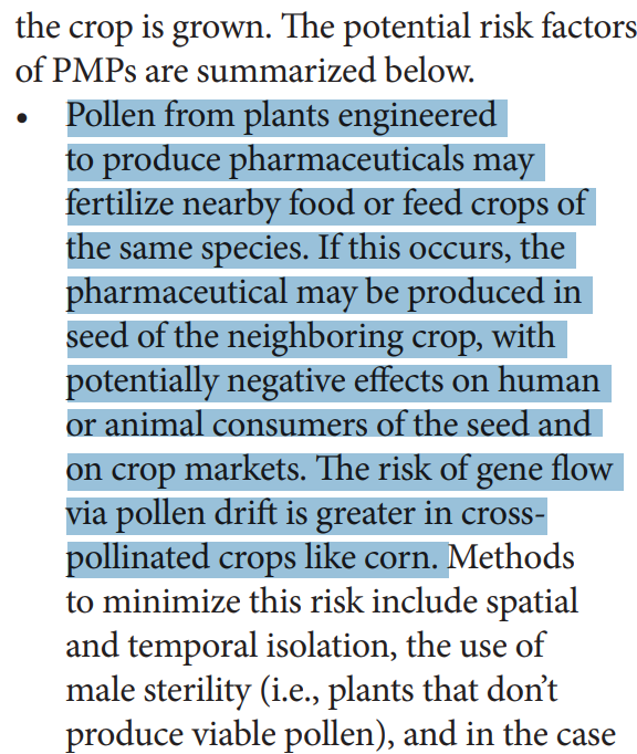 The same document also outlines the exact problem that Busch went on a tangent over, which they now call, “Gene Flow via Pollen Drift”, so scientisty. Def sounds way more complex than WIND. Another issue they point out is Pharm workers being drugged by the plant leaves, pollen and dust. (On the upside, none of the Pharmers will ever request a day off work to take their kid to beach, or the doctor, or their first day of school. Thanks spermicide!)