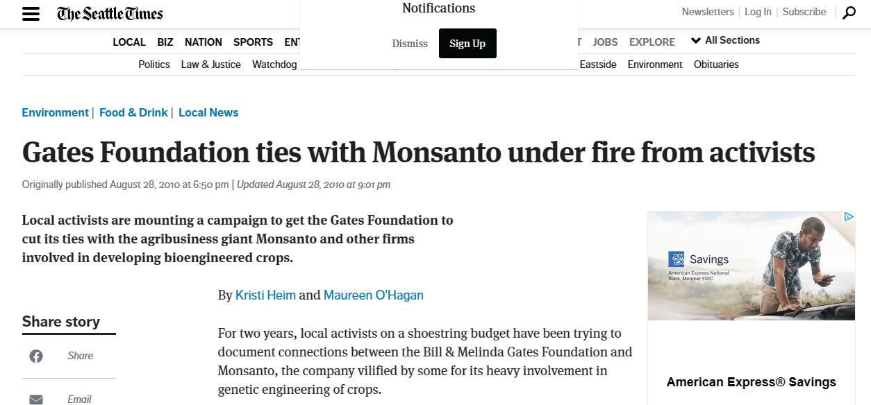 2010: Bill Gates, who, at this time, is already a B-cup a mega-activist in the GM world and vaccine industry, teams up with Monsanto so they can destroy our lives together: