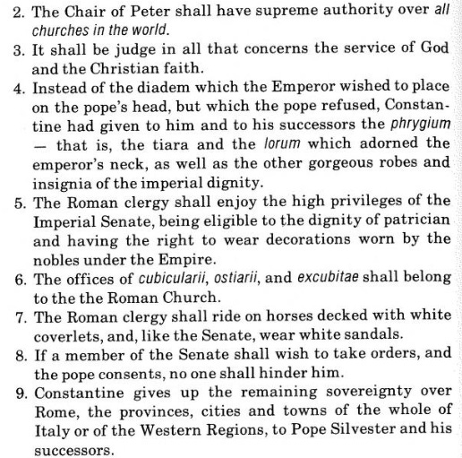 Out of nowhere, it just appeared. It was presented by the Catholic Church as an official document, said to have been created by Roman Emperor, Constantine The Great, stating his desire to make a large donation to the Church - and by large donation, I mean a gift of biblical proportions. The Donation of Constantine stated the emperor wanted all successors of Peter (meaning the papacy, aka “The Chair of Peter”) to be the heirs to the Roman Empire, therefore gifted large territories of land in addition to other perks including:
