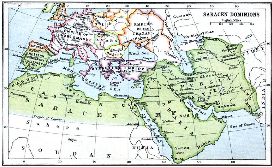 Although the papacy “owned” the Roman Empire due to the Pope’s forgery, the Muslims were not keen to respect the Catholic leaders as rightful land owners. Muslim control of Sicily began in 827 (shown below in green). During this period, Sicily became a prosperous and influential commercial power in the Mediterranean. With success at hand in Sicily, the Muslims targeted Rome.