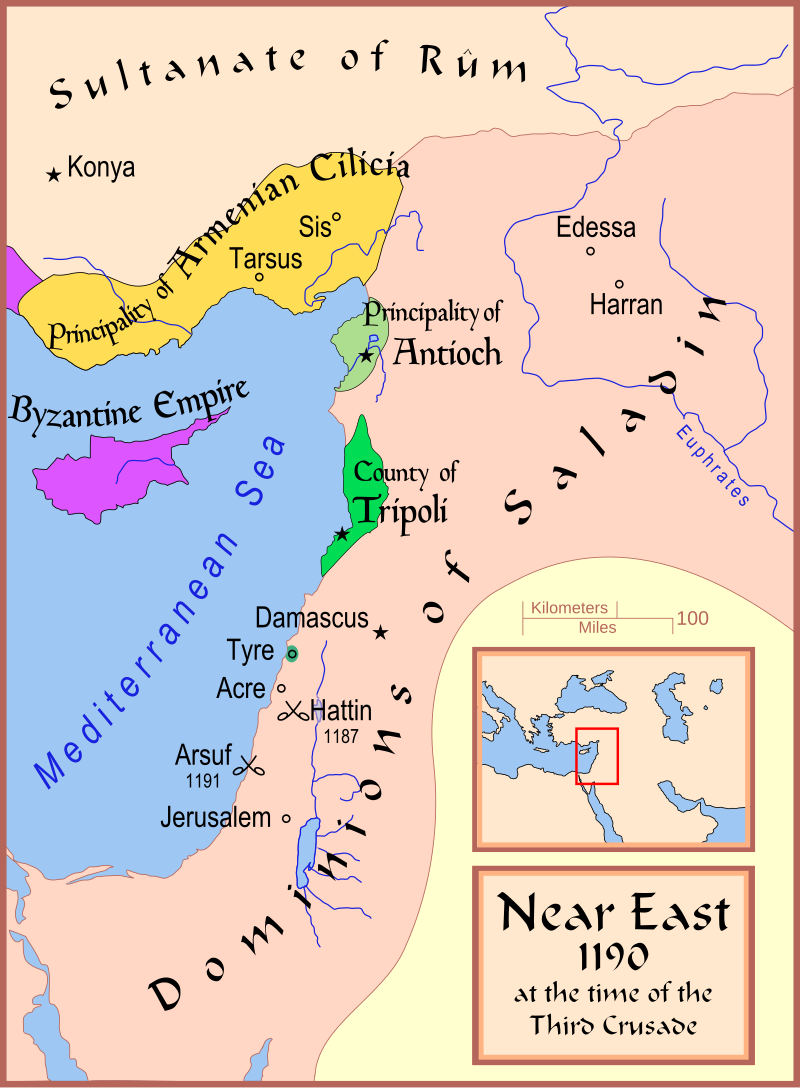 After the First Crusade, four Crusader states were established in the Holy Land: the Kingdom of Jerusalem, the County of Edessa, the Principality of Antioch, and the County of Tripoli.