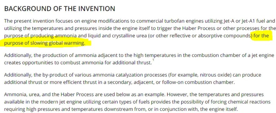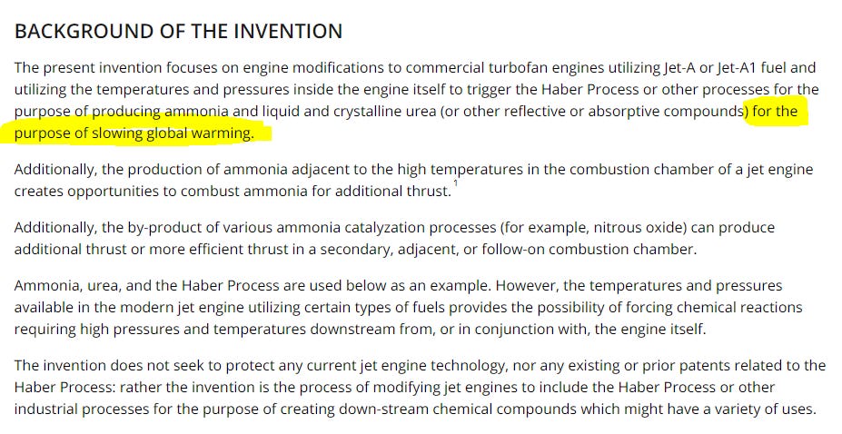 The patent is for modifying existing commercial jet engines so we can make them into planes that spew, “reflective or absorbing compounds to reduce global temperature”. YAY! DRIVE THAT TEMPERATURE DOWN, BABY!