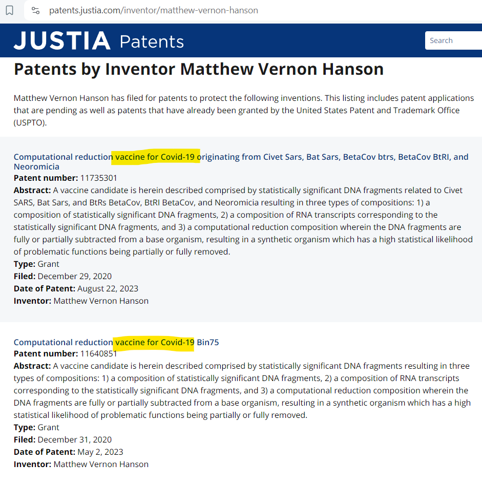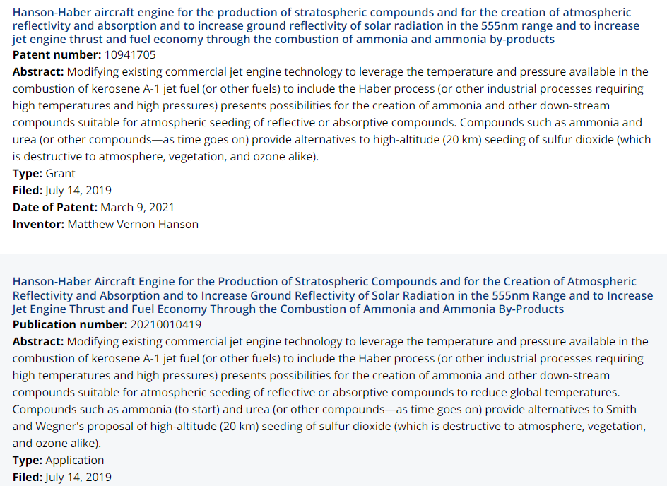 Now get this: Hanson-Haber is the company with the special piss-spraying plane engine and the piss-alternative additive (sold separately). Matthew Vernon Hanson from Hanson-Haber owns a couple more patents (other than the sun-piss stuff). Do you know what his other patents are for?