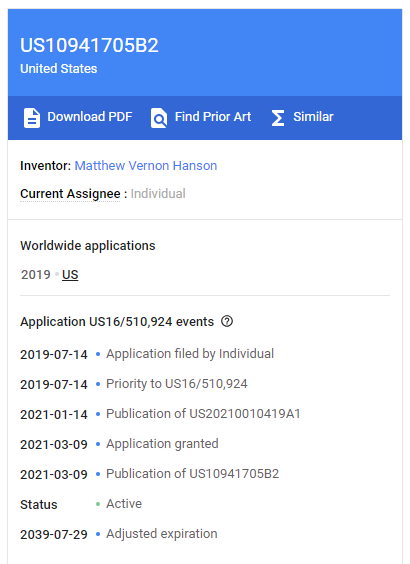 In 2019, Hanson-Haber filed a plane engine patent. It became active in 2021 and is currently more active than a herpes flare-up: