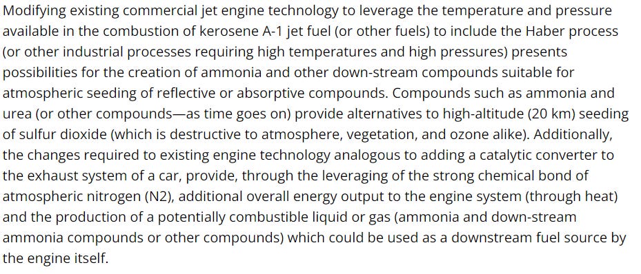 Although there already were patented engines that can handle additives, Hanson-Haber claims the reason for their patent is to, “provide alternatives to high-altitude seeding sulfuric acid”, because drenching the earth in sulfuric acid, a hazardous carcinogen that should never been inhaled, might not be such a good idea after all.