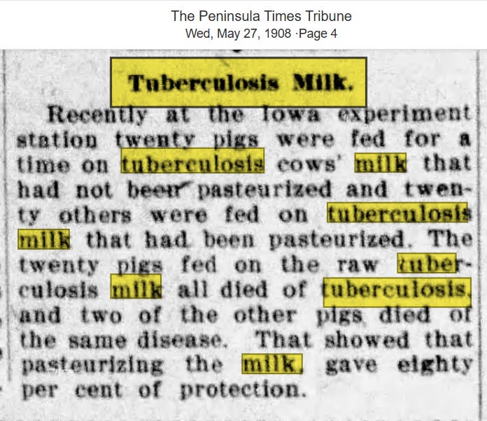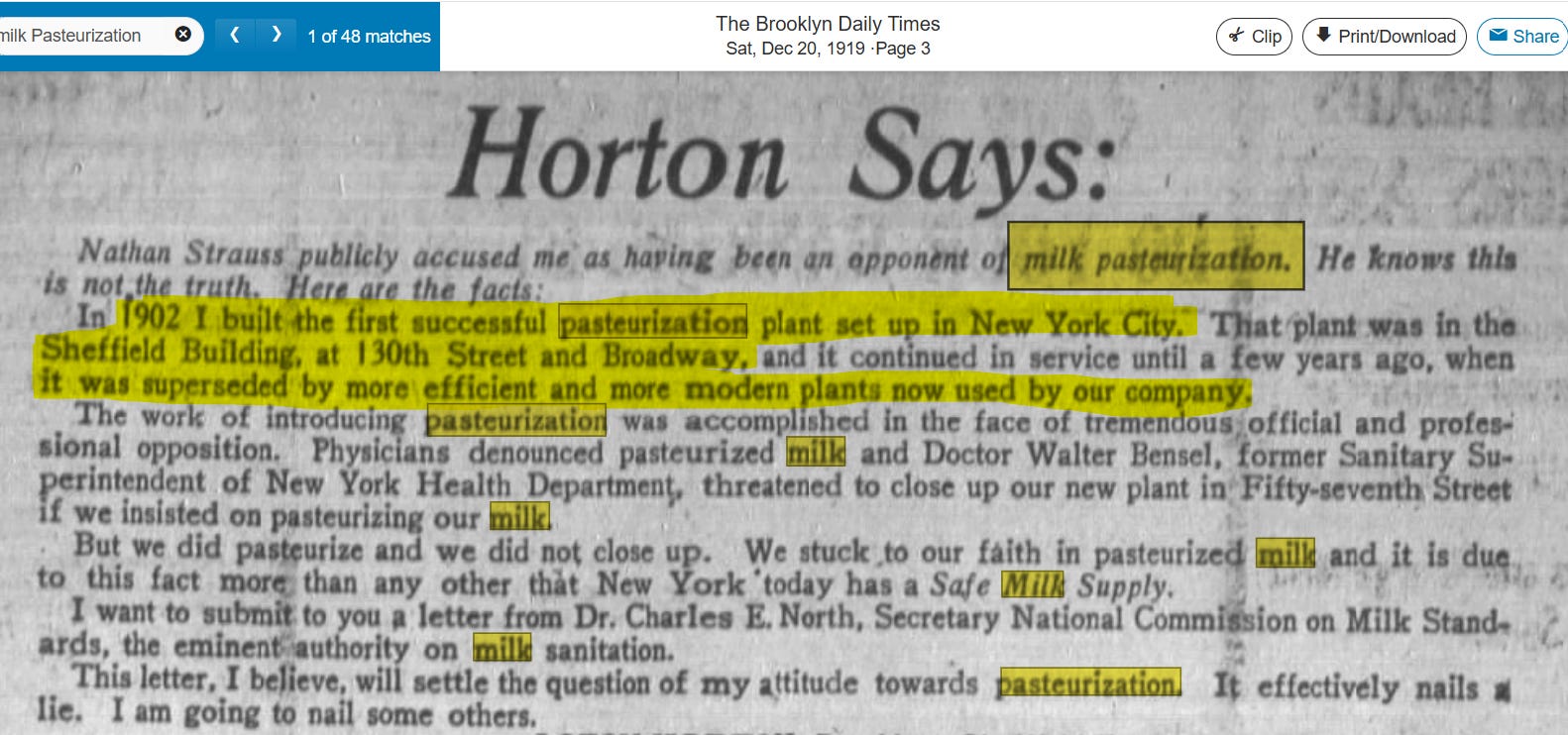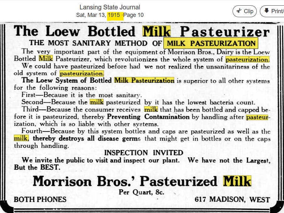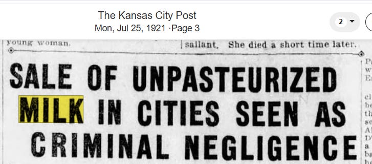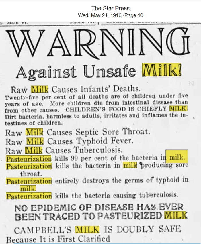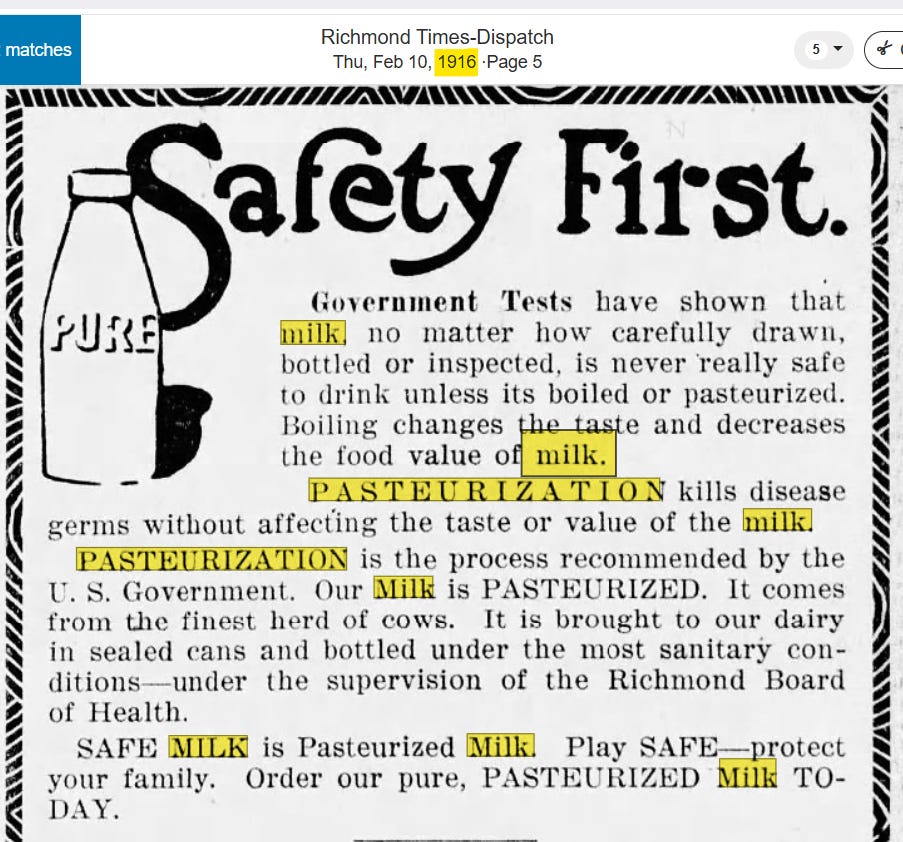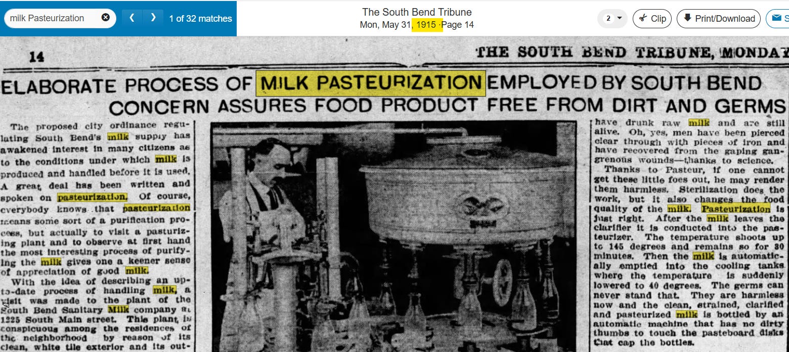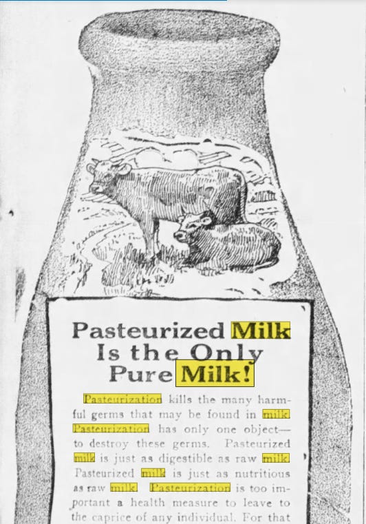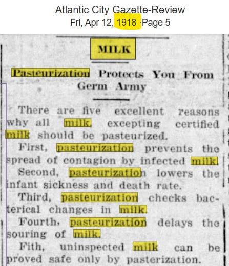 Milk has been pasteurized since the early 1900s and the entire reason it is called Pasteurization is because the crazy-germ-vaccine-dude’s name was Louis Pasteur (he was the one that came up with the scheme), so why is there is no mention of his studies, or any of the foundational studies in the FDAs resources list? To take it a step further, the internet is trying to tell us pasteurization was not used in the US until the 1960s which clearly is not true because the newspaper archives show otherwise. Pasteurization may not have yet become law but it sure as hell was being deployed: