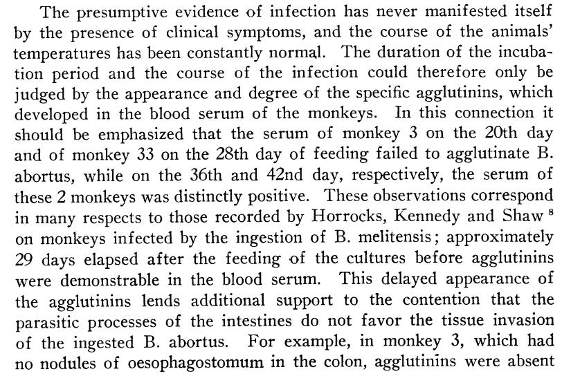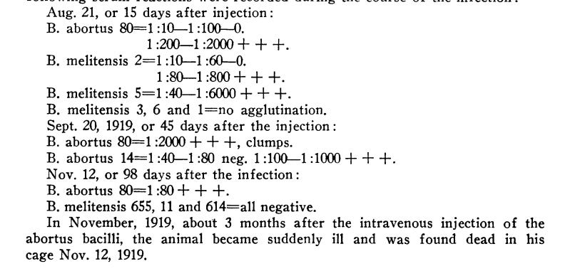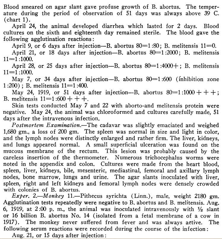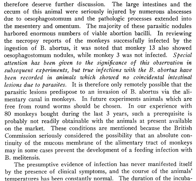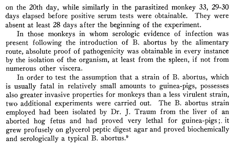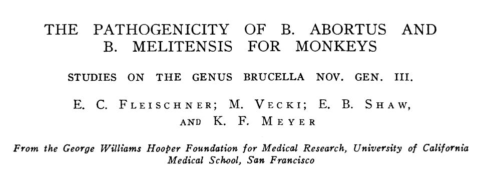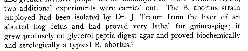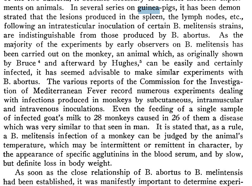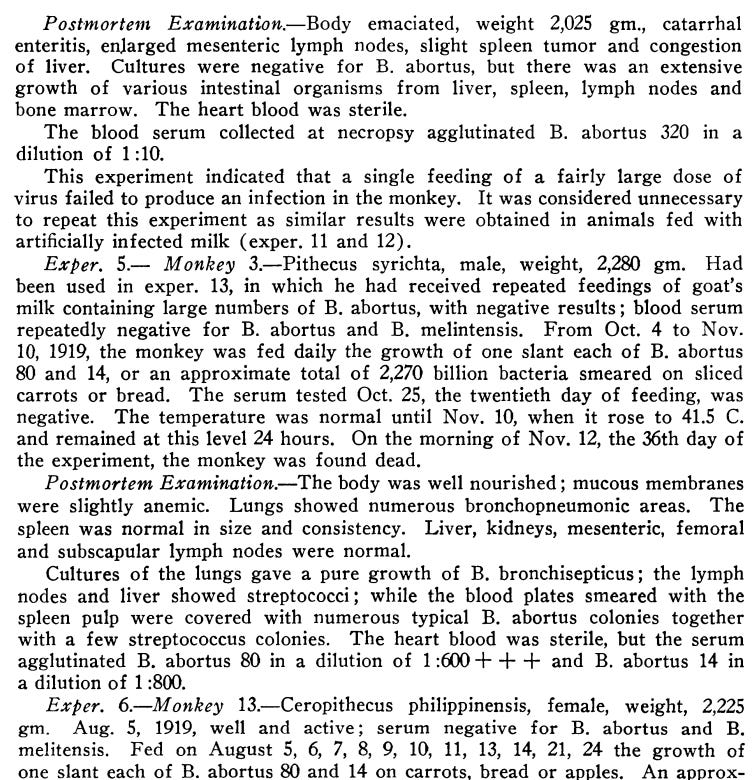I located a really interesting paper from 1921 that outlines the transmission studies which date back to the beginning of the experiments; Pasteur Institute, 1893 ← Louis Pasteur was the crazy germ-obsessed guy who was also very active in vaccine development. The other studies in this paper are from 1918 through 1920. These are the experiments which proved two types of pathogenic Brucella bacteria were not only inside cows but were also in sheep. Big names were involved with this history-changing project including the University of California Medical School.