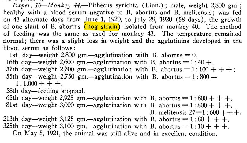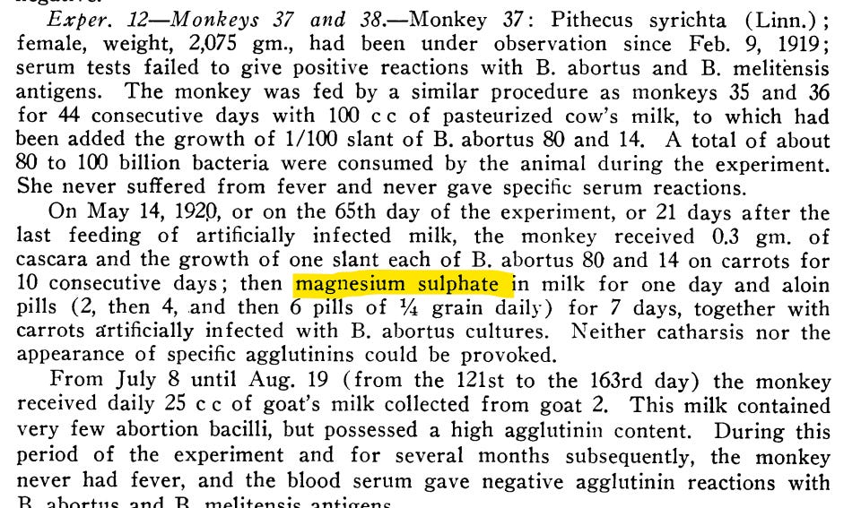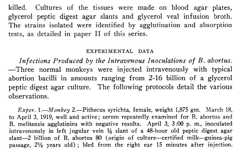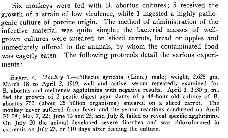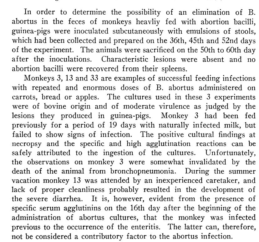 On May 14th of 1920, a new experiment began. This time around, for 10 consecutive days, a monkey was fed “artificially infected milk” and given cascara (coffee cherry tea) along with lab-grown “bacteria” on 14 carrot slices. On the 11th day the monkey was provided the same number of bacteria-carrots in addition to milk mixed with magnesium sulphate (a laxative), accompanied by 6 aloin pills (another laxative). The lab lords knew if the monkey developed a fever, had diarrhea or other symptoms, it would have meant transmission was successful… but… to the scientists dismay, nothing happened. Larger and larger quantities of “the bacteria” were added into the primates diets by putting the manmade concoction on the starving, terrorized animal’s food. Thankfully for science, eventually they were able to say these “experiments indicate that a fairly high percentage of monkeys can be successfully infected via the alimentary tract when large and repeated doses of B. abortus [“the bacteria”] are fed on sliced carrots, bread or apples.” - it was official, the bacteria “found in milk” can indeed cause illness when consumed orally!