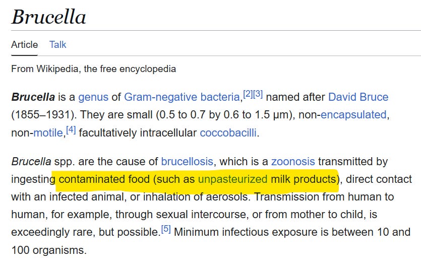 Let’s start by quickly looking at what science claimed: Brucella (an allegedly diabolical bacteria aka “germ” aka “virus”) was hiding away inside cows and coming out in milk. Here’s modern-day Wikipedia: