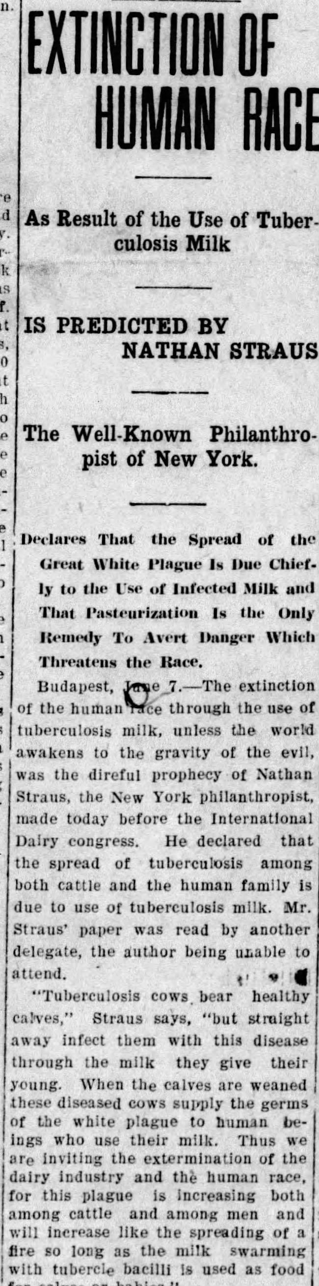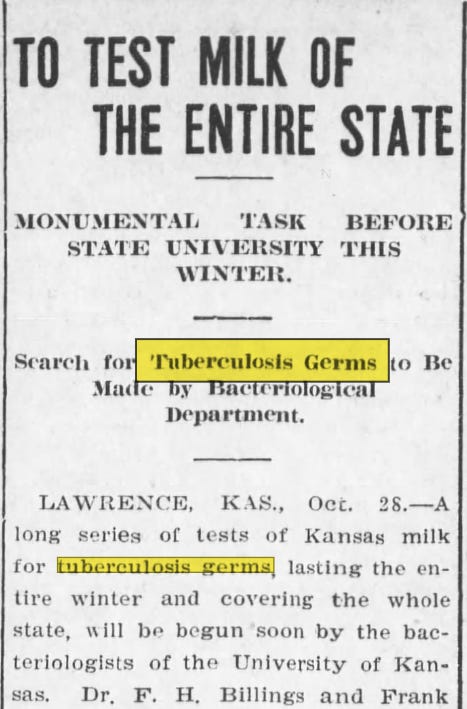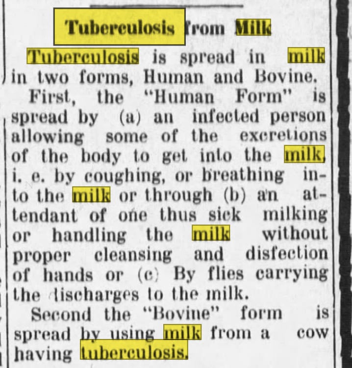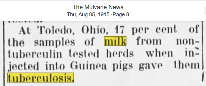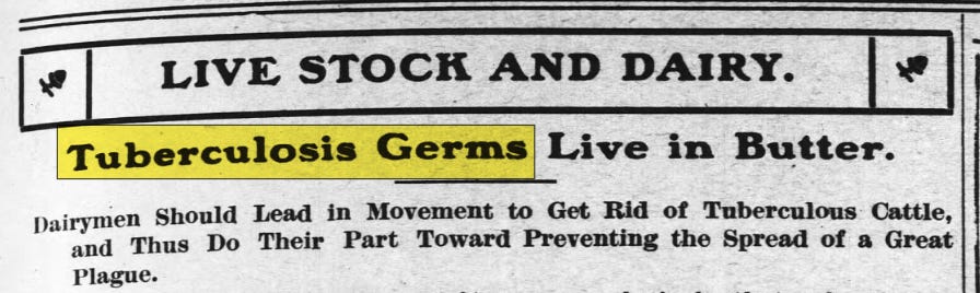 In the early 1900s the media informed the public that we were all going to die because of “Tuberculosis Milk” which was the cause of “The Great White Plague”: