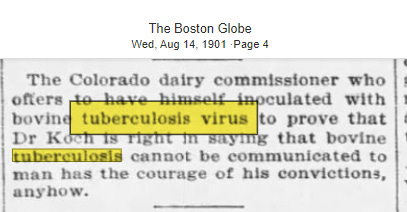 Science claimed (and still claims) when the infected milk was drank, people developed Tuberculosis symptoms which were fevers, cough, pain, weakness and more. These happen to be the exact same symptoms as Yellow Fever, Malaria and Typhoid, so it was difficult to tell if a “disease” came from a germ in milk, a mosquito, poor sanitation, a virus hiding on a door handle or something else.