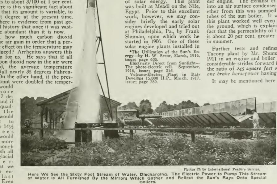 In 1919, an article appeared in the Electrical Experimenter. This invention was similar to the Pyrheliophor, except this one could use the sun to pump water 60 feet into the air.