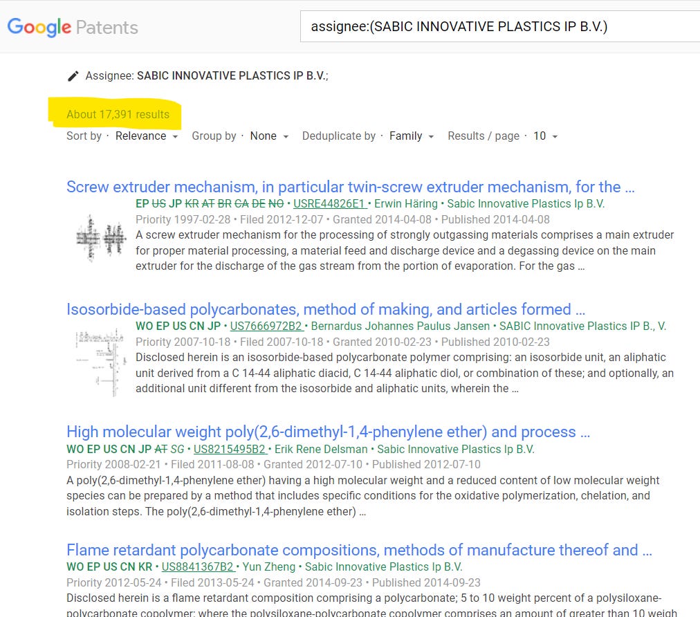 2008: Remember that solar oven device from 1904? I was able to track down what happened with one of the patents, US797891. I discovered that, in 2008, it was obtained by a company in Saudi Arabia called SABIC INNOVATIVE PLASTICS IP B.V.. When I ran a search to see if they have any other patents, results tie them to over 17,300: