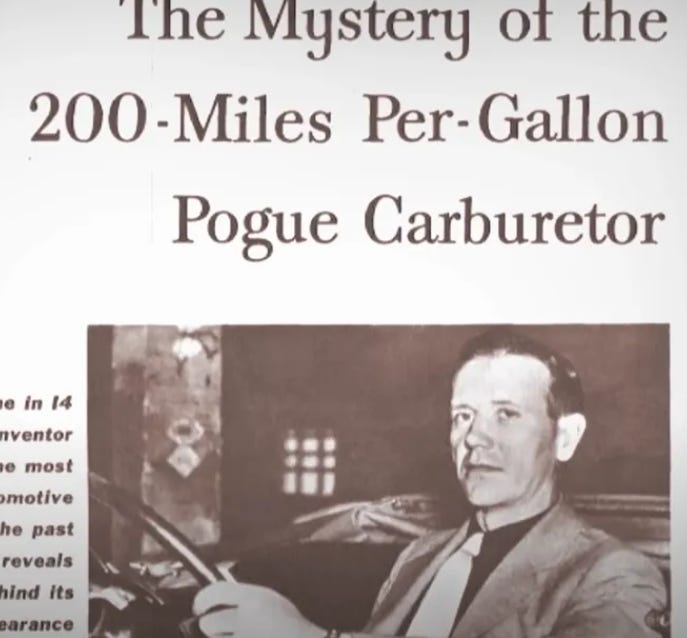 In 1936, Charles Pogue was issued patent US1997497A for a clean high mile carburetor that was capable of achieving over 200 miles per gallon.