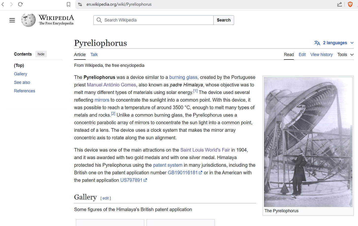 In 1904, the NY Times ran a story on it called “PYRHELIOPHOR, WONDER OF ST. LOUIS FAIR; Sun Machine Invented by Father Himalaya, a Portuguese Priest, Generates 7,000 Degrees Heat Fahrenheit”. Fast forward to 2024 and there is nearly no information on the inventor or what happened to the Pyrheliophor. Here’s the entire Wikipedia page, which only shows a second, smaller model: