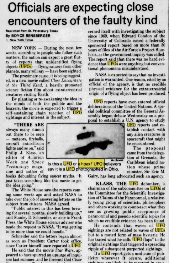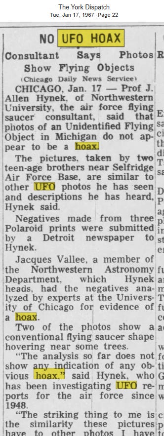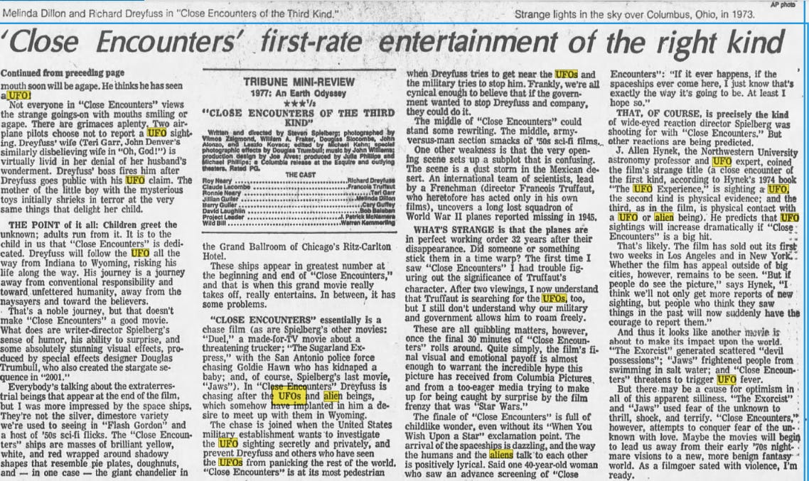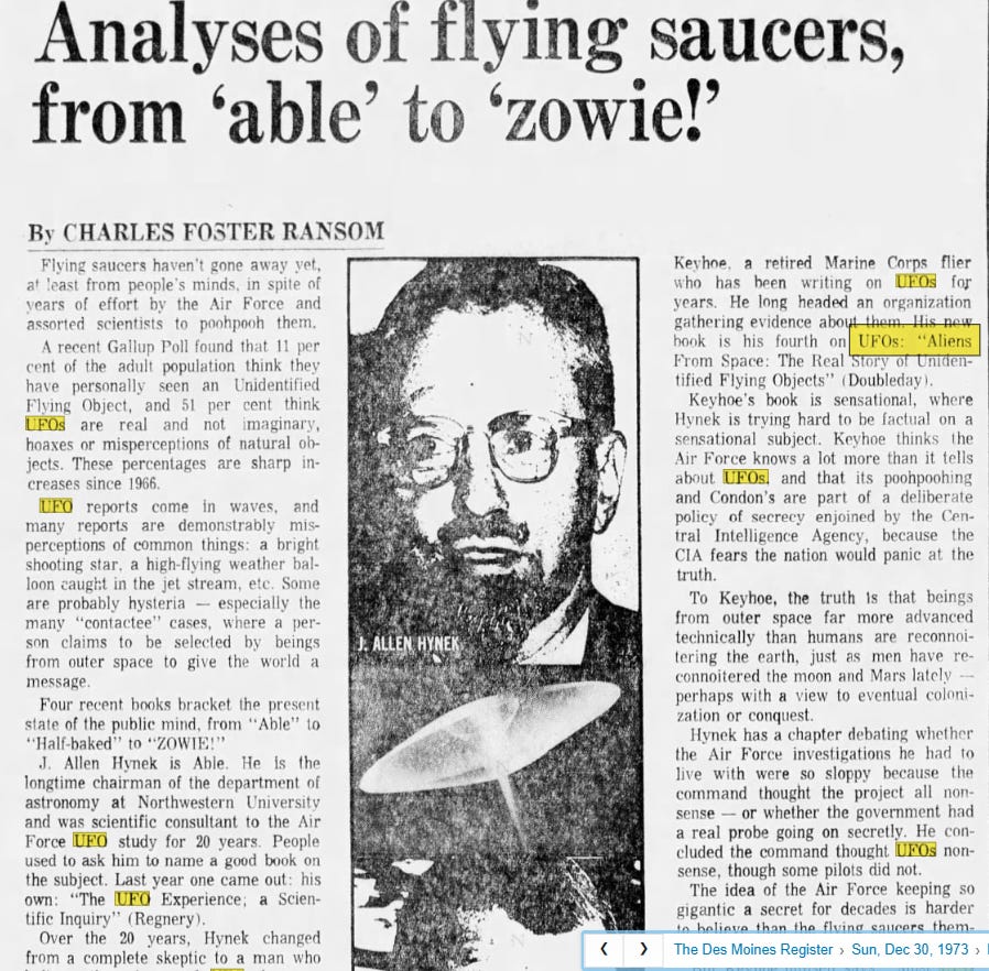 This same year - literally the exact same year - a UFO researcher named J. Allen Hynek established a classification system for “close encounters”. According to his system, a close encounter of the first kind is defined as “a visual sighting of a UFO within 500 feet (approximately 150 meters) of the witness"”. I should probably also mention that Mr. Hynek was a scientist at the Johns Hopkins Applied Physics Laboratory and was also an advisor to the US Air Force, DING!. In addition to being all of those things, he also worked for the Smithsonian, tracking so-called “satellites” in “outer space”.