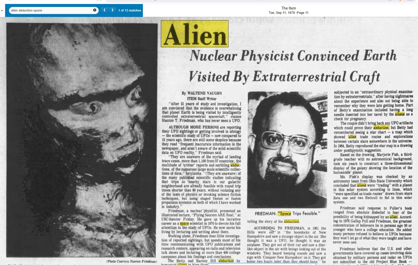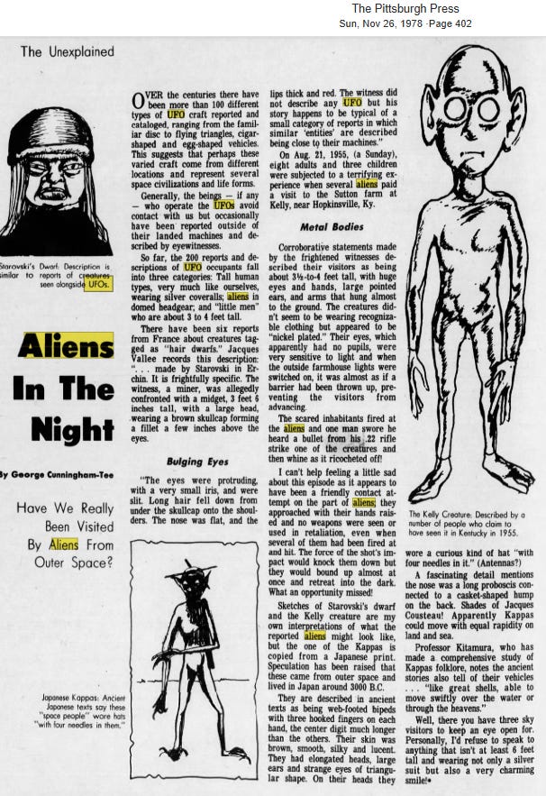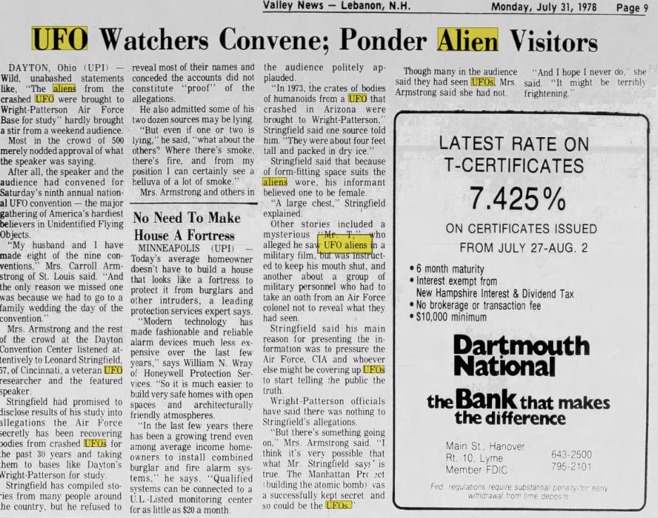 The same year the description was given, a story appeared in the paper stating “crates of bodies of humanoids from a UFO that crashed in Arizona were brought to Wright-Patterson [Air Force base]”. DING!