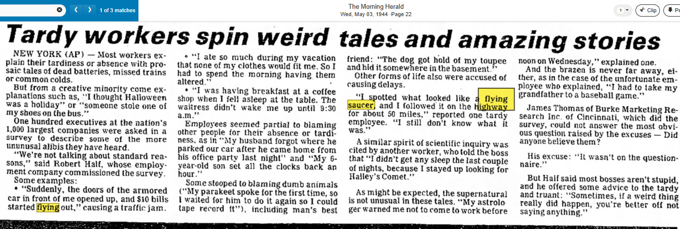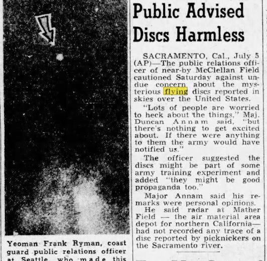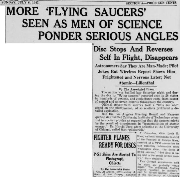 In May 1944, after only a few years of being propagandized, the newspapers reported that citizens began seeing flying saucers: