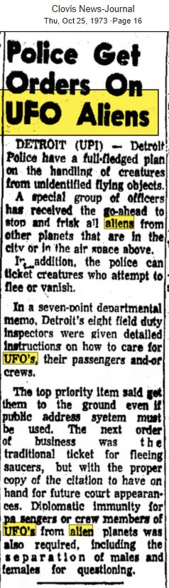 In Detroit, Michigan, in 1973, police were given orders to stop and frisk all aliens from other planets. I absolutely must summarize what this article says for you because it’s a gem: “A special group of officers has received the go-ahead to stop and frisk all aliens from other planets that are in the city or in the air space above…. Detroit’s eight field duty inspectors were given detailed instructions on how to care for UFO’s, their passengers and-or crews”. It then goes on to outline how fleeing saucers will be dealt with and states “diplomatic immunity for passengers or crew members of UFOs from alien planets” would be given. I read this and thought, “Oh thank God! Nobody wants to live in an America in which innocent extraterrestrials are thrown behind bars!”.