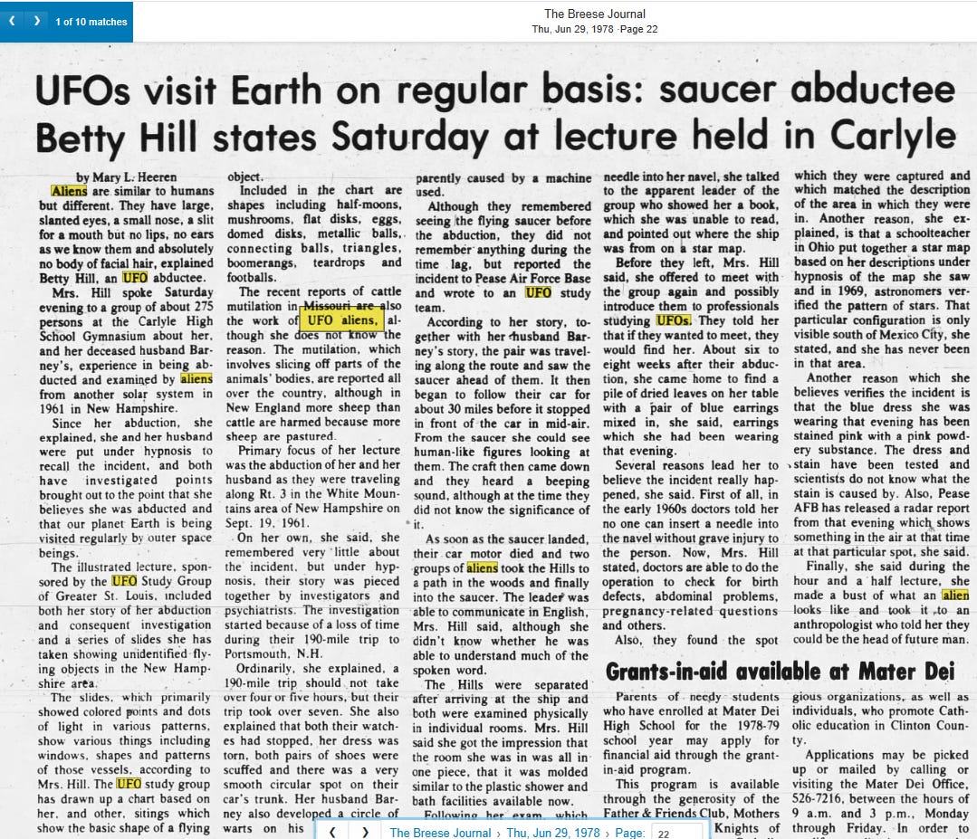 Because UFOs were everywhere, Betty’s own sister had seen a UFO a few years prior to the day Betty Hill saw one of her own. In the Hill’s case, they were conveniently driving on a deserted road near Lancaster, New Hampshire when a UFO came out of nowhere then hovered above them. Mr. Hill exited his vehicle to check it out and, using binoculars (because everyone keeps a pair of binoculars in their glovebox), saw “eight to eleven humanoid figures, who were peering out of the craft's windows”. The couple was now so scared that they drove away as fast as they could but as they drove they “fell into a daze”. When they awoke they were in a different location, Concord, New Hampshire (which is a straight shot down the same road).