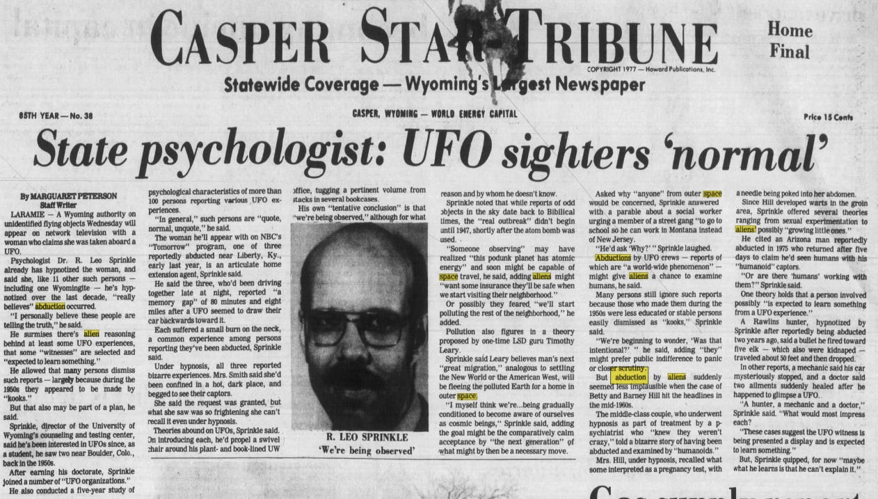 It was also right around this time that our buddy Ray Stanford appeared on the scene, this time around he was peddling UFO content. If you don’t remember Grandpa Ray-Ray, in my article The Dinosaur Hoax: The NASA Rabbit Hole, we met Mr. Ray Stanford. He’s the dude who discovered super-duper-famous-history-making-once-in-a-lifetime dinosaur footprints literally outside of NASAs building. The media told us he was just a self-taught fossil hunter, but upon deeper investigation, he works for NASA. Technically, he is subcontracted by NASA because his actual employer is a defense contractor who is hired by The World Bank (you can’t make this sh*t up, DING!). This dude is deep in bed with the government, but long before he became a dinosaur hunter, years before NASA even existed, on November of 1954, Grandpa Ray-Ray experienced a historic UFO sighting: