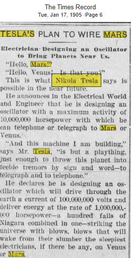 In 1902, only a couple years after the airship hysteria, Nikola Tesla, while running tests on radio waves, claimed to have picked up a strange signal. Not much was thought about it at the time, it was just an unexplainable signal. (If you read my piece on the insane history of the V2K “Voice of God” weapon, you already know that I believe Tesla really did pick up a signal and I believe this signal was coming from the US military, but it is equally possible there was no signal and he was part of the ploy - more on this in a moment)