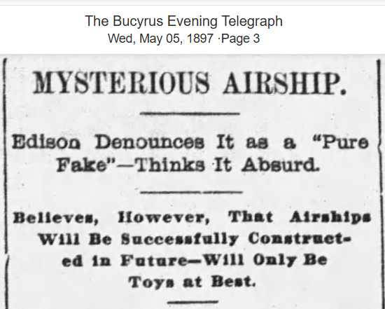 To squash the whole thing, the airships were blamed on a kooky millionaire inventor then the media stopped reporting on alleged airship sightings.