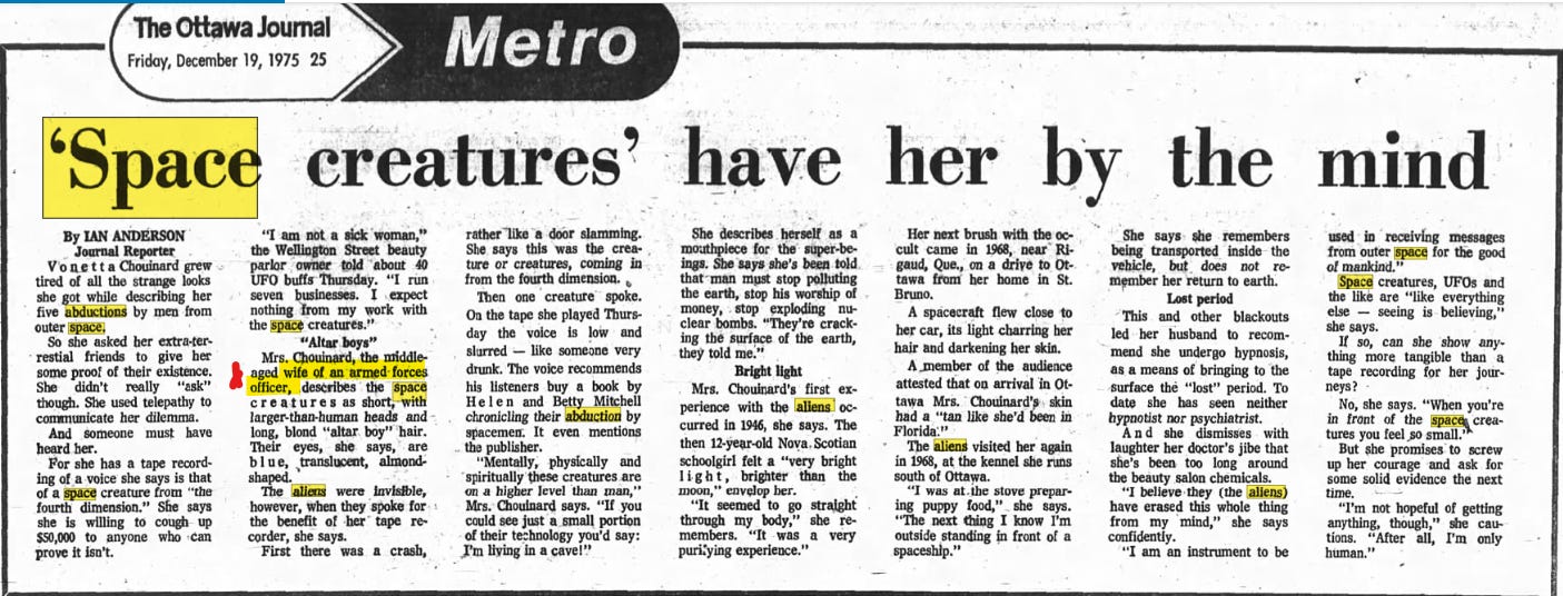 In 1975 we see the first instance of aliens telepathically communicating with people. The person the aliens were harassing happened to be the wife of a military man, DING!