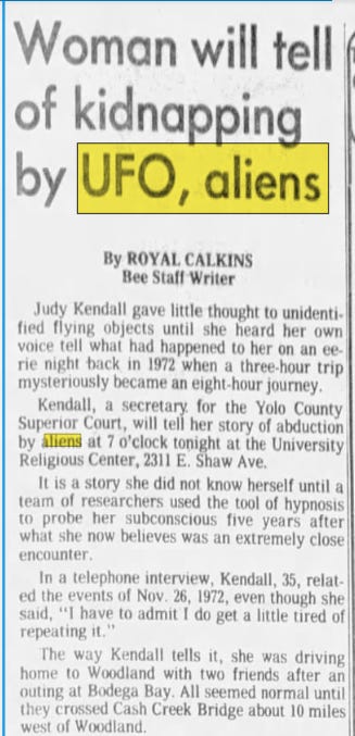 Another abduction occurred not long after the Hills, in 1972. This time around, a woman, who also happened to be a government employee, through hypnosis discovered she had been abducted by aliens - because that’s not sketchy or anything. She was then given public speaking assignments to share her story.