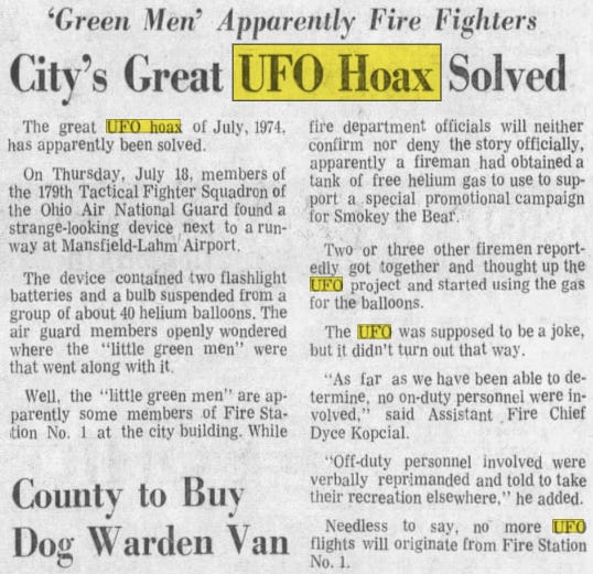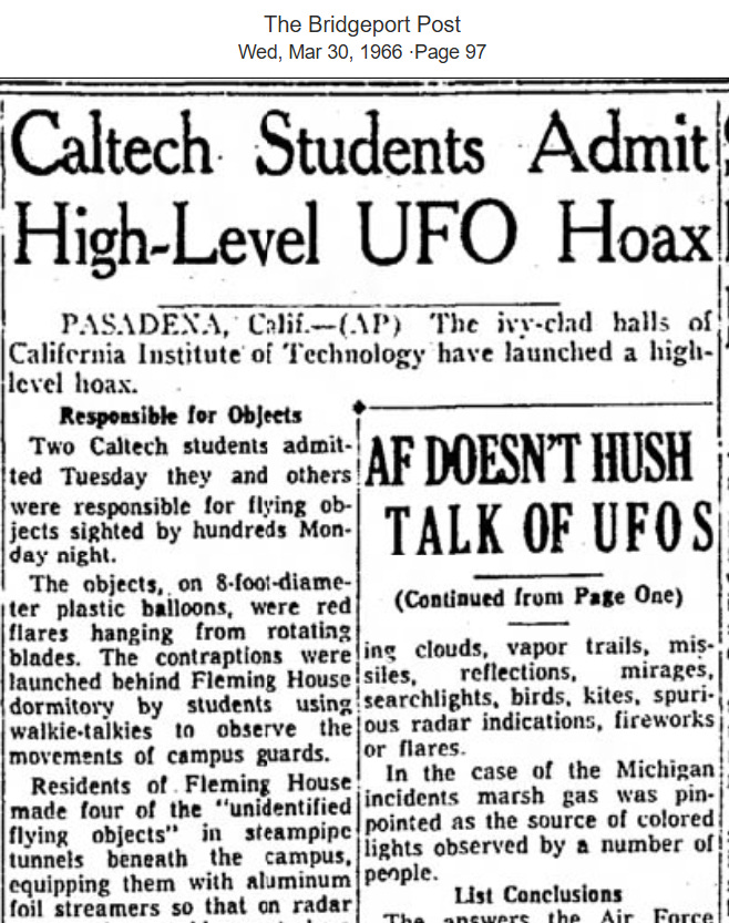 In 1966 a “high-level” UFO hoax was pulled off allegedly by some Caltech students. The students attached flares to balloons affixed with metal streamers to guarantee they would appear on radar. The hoax worked, hundreds saw it and it made the news.