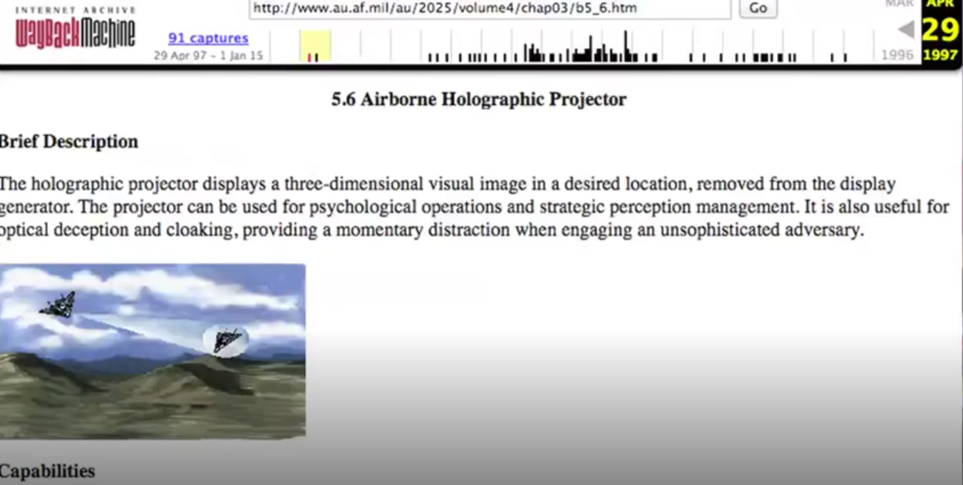 And it just so happens that in 1997, on the AU Air Force website, was a page that outlined Airborne Holographic Projectors (DING!):