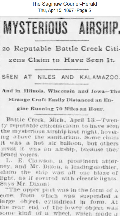 By the end of 1897, the presses claimed airships had been witnessed in California, Arkansas, Nebraska, Illinois and Michigan too.