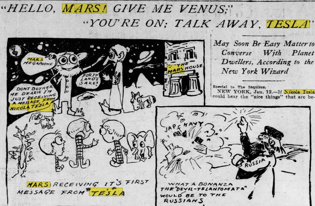 As A Trip to the Moon was being spread, in 1905 Nikola Tesla suddenly began claiming to be building a machine to communicate with Mars. It seems he had become convinced that the strange signal he picked up was originating from Mars or he was in on the scheme, the timing is uncanny. It was at this time that Tesla was buddies with Carnegie and Carnegie was into astrology, space and… eugenics. The newspapers eagerly ran Tesla-Mars communication stories.