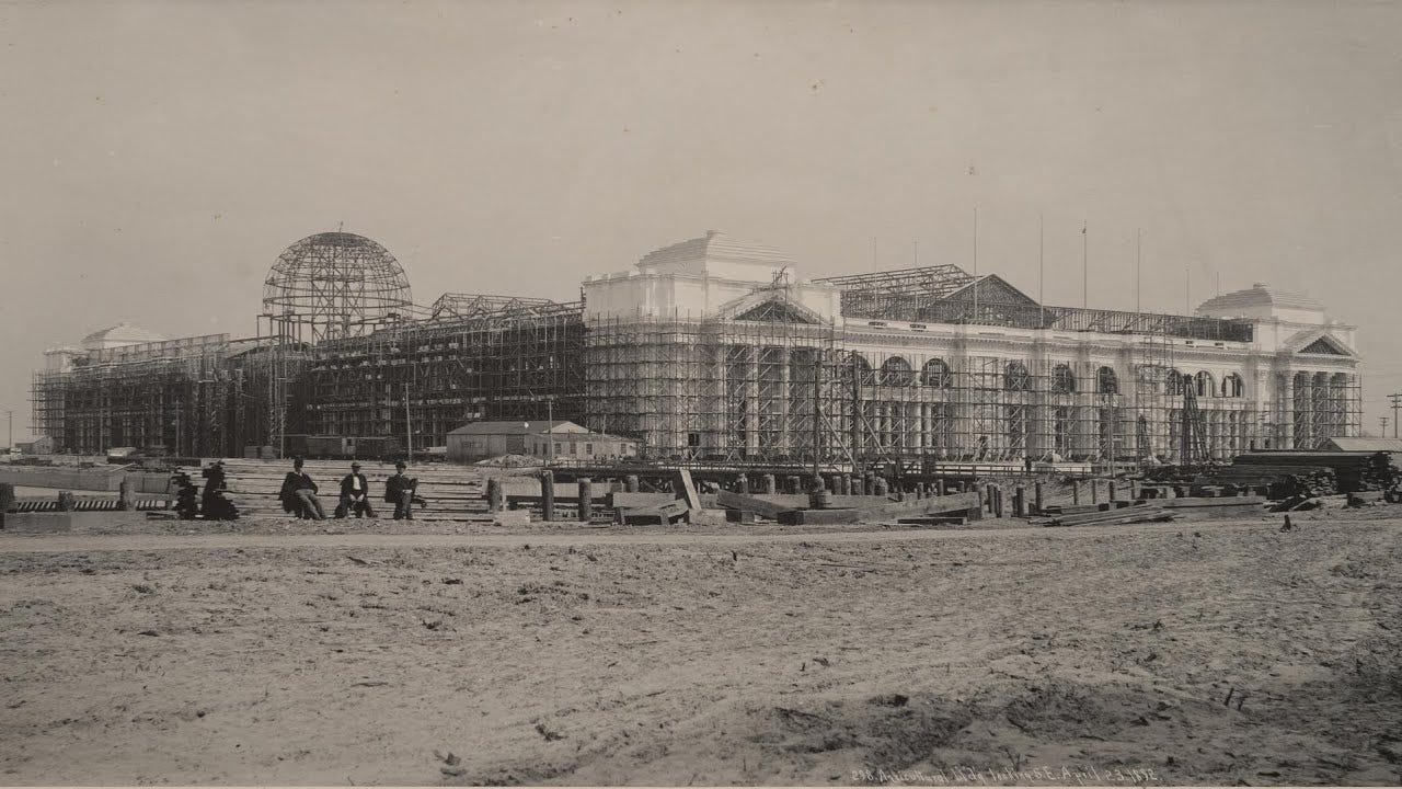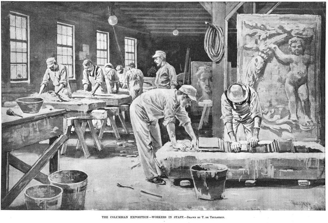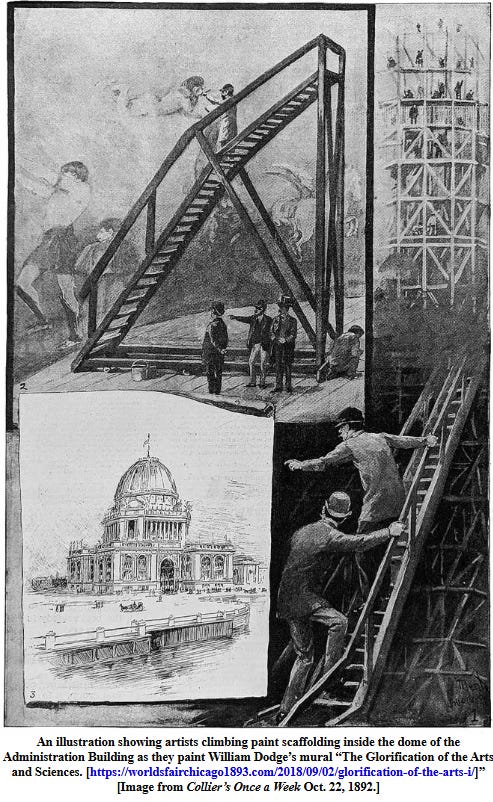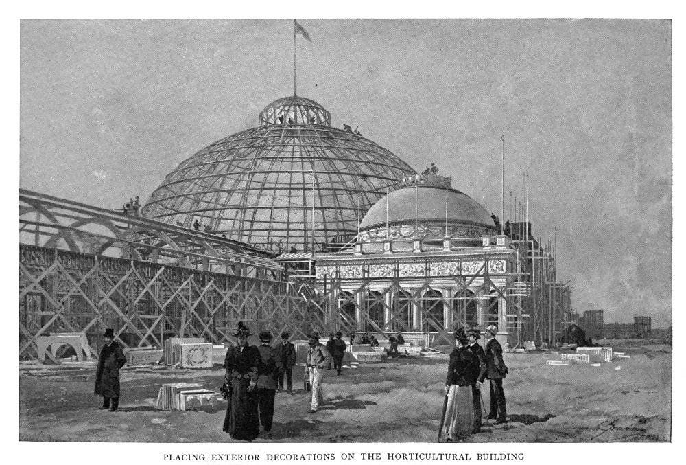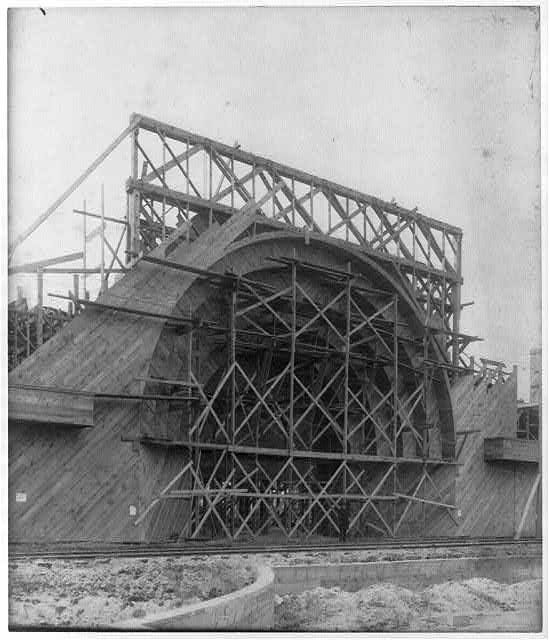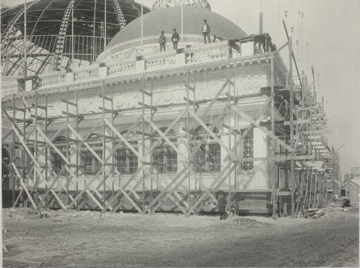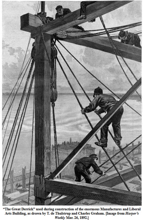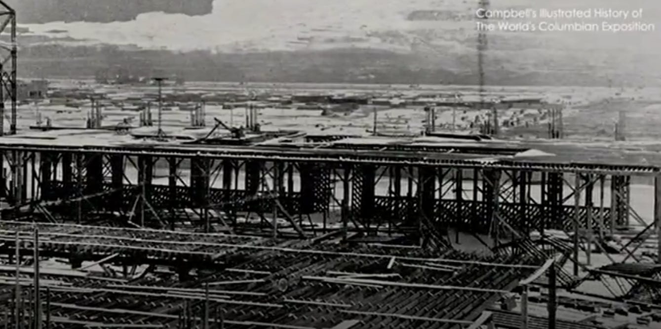 Trying to track down legitimate construction photos of this event is basically impossible. The few that do exist, such as the two shown below, are both illustrations from “Campbells Illustrated History of the World’s Columbian Exposition”: