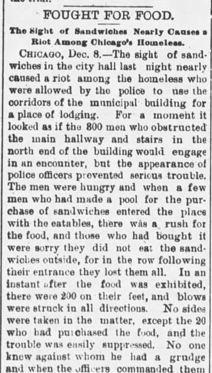 The papers also reported physical altercations over food were occurring because so many homeless people were desperate to eat.